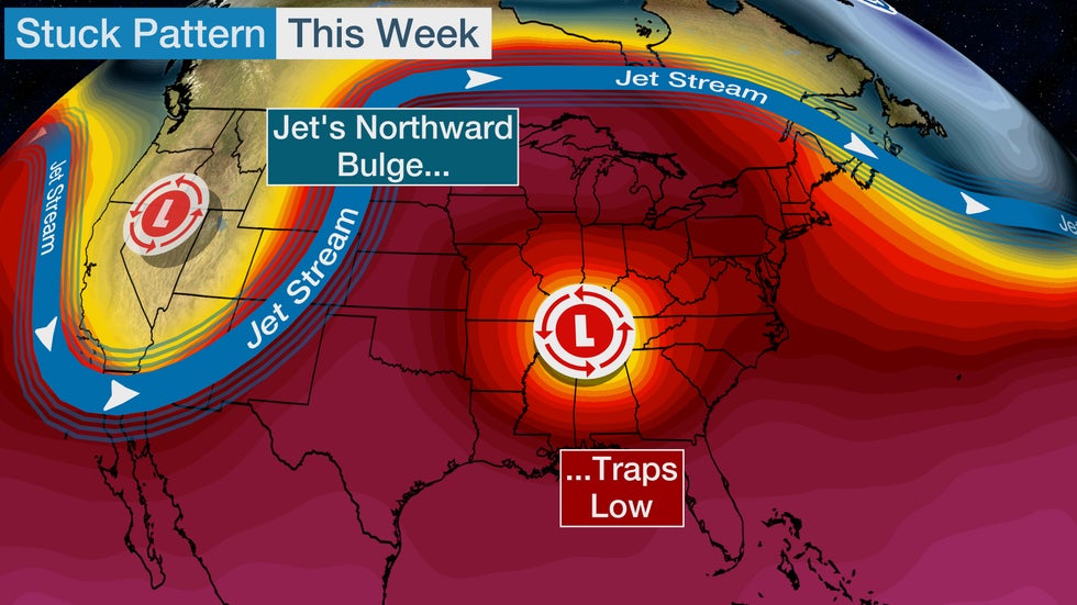 The jet stream will bulge so far north in the central and eastern U.S. that it will leave behind a swirling low in the East – what meteorologists call a "cutoff low." That swirling low is essentially cut off from the jet stream that would steer it away quickly.