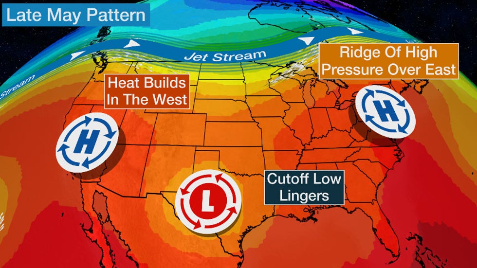 Two upper-level areas of high pressure will be in place over portions of the East and West for the last week of May. This setup often correlates with warmer temperatures, which will be the case in the week ahead.