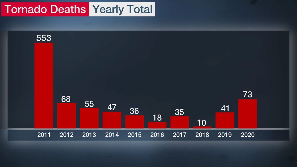 Another factor in this year's loss of life is that some of the deadly twisters struck at night. Tornadoes occurring at night are more than twice as likely to be deadly as those during the day, according to a study.