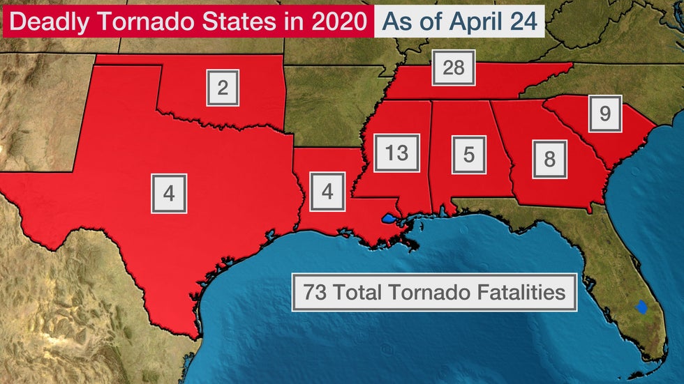Tornadoes in 2020 have claimed 73 lives as of April 24, according to NOAA's Storm Prediction Center. Those have all occurred in eight southern states, with Tennessee and Mississippi having the most.