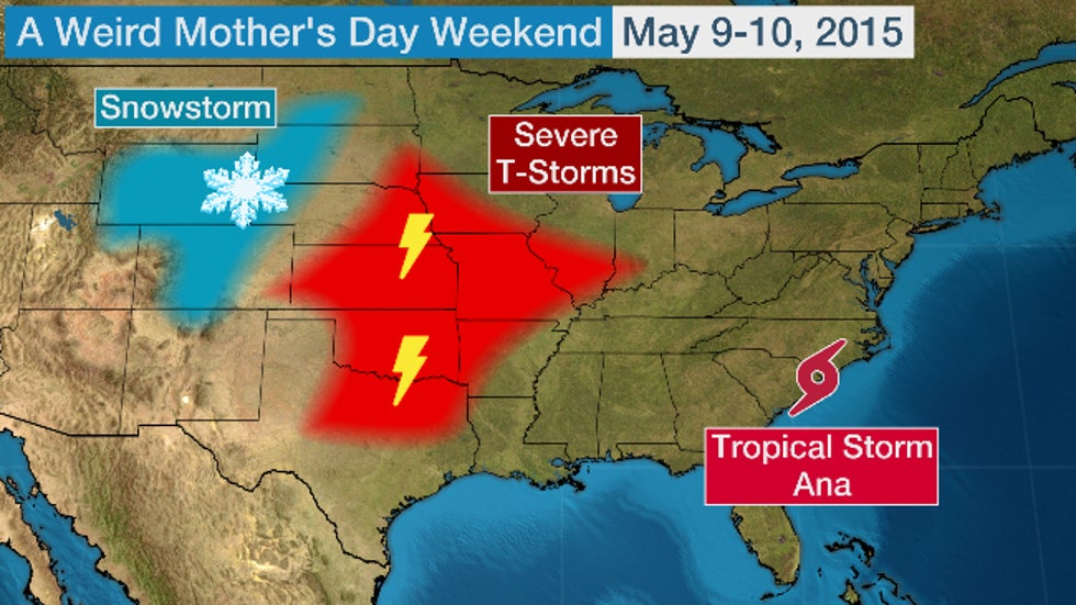 A snowstorm, severe weather and a tropical storm landfall all occurred in the U.S. during Mother's Day weekend 2015.Five years ago this weekend, a strange juxtaposition of weather events spanning the meteorological spectrum affected the United States in a way unlike any other recent Mother's Day weekend.