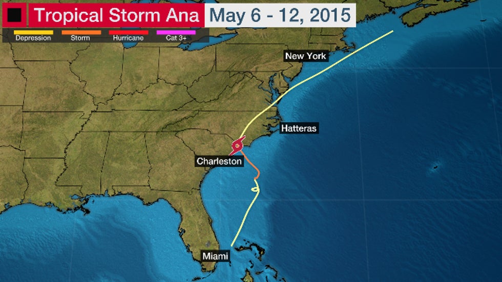 Track history of Tropical Storm Ana from May 6-12, 2015.Ana produced some flooding rainfall in the coastal Carolinas, as well as some minor beach erosion and wind damage, but overall had fairly low impact.