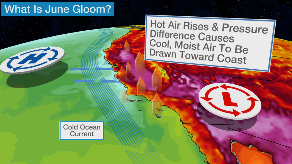 Typically, this cold air remains off the coast, but as we enter the summer season, intense heating of inland areas, such as the Central Valley and Mojave Desert, sets up a broad area of low pressure known as a thermal low.