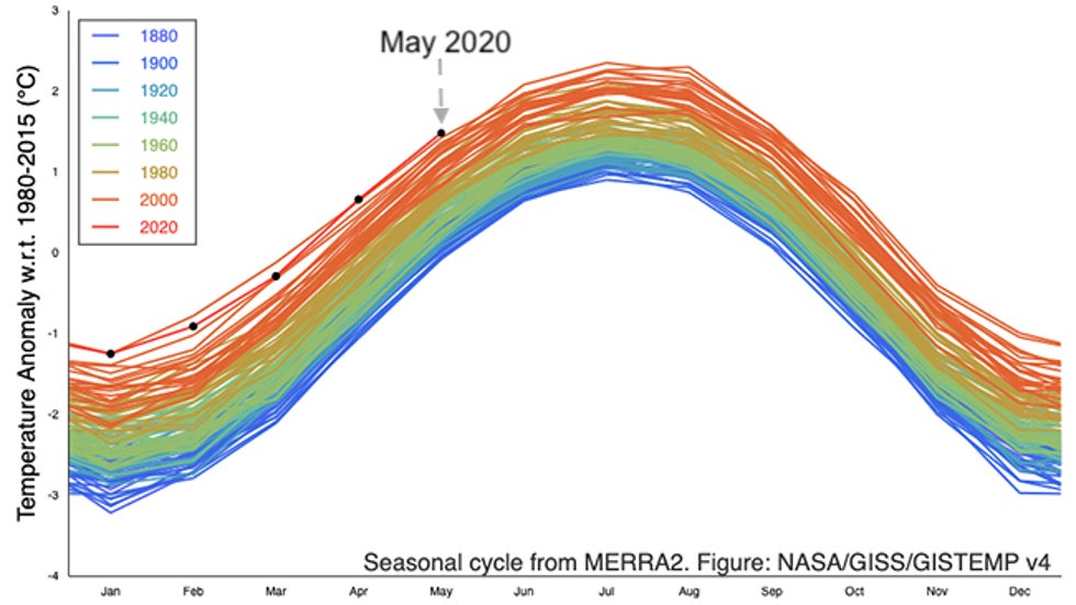 NASA's Goddard Institute for Space Studies found May 2020 global temperatures were 1.02 degrees Celsius above the 1951-1980 average, the warmest May in their records dating to 1880, 0.06 degrees Celsius above the previous record warmest May in 2016.