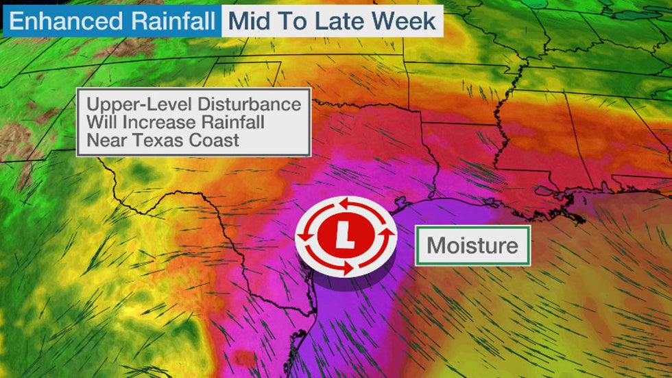 This should enhance rainfall in parts of southern, central or eastern Texas later this week, though exactly where and when the heaviest rain may fall remains uncertain at this time.