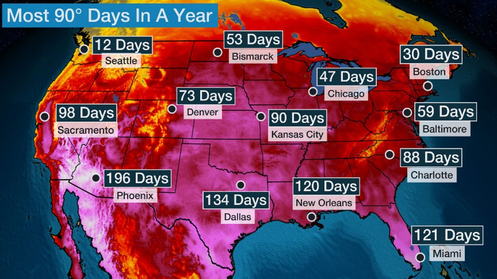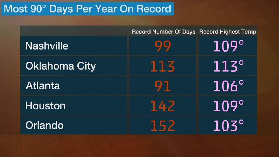 Many cities in the South have measured more than 100 days of 90-degree temperatures in a single year. This includes most of Florida and the Southern Plains. Orlando recorded over 150 days of temperatures soaring above 90 in 1919, which is more than 40 days higher than its average of 106 days.