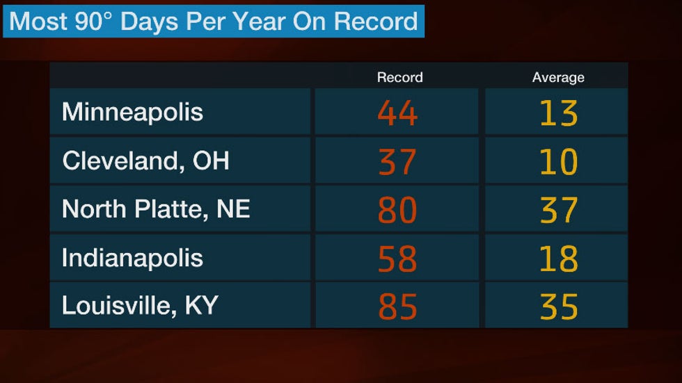 The records for most 90-degree days in a year vary greatly in the Midwest.
