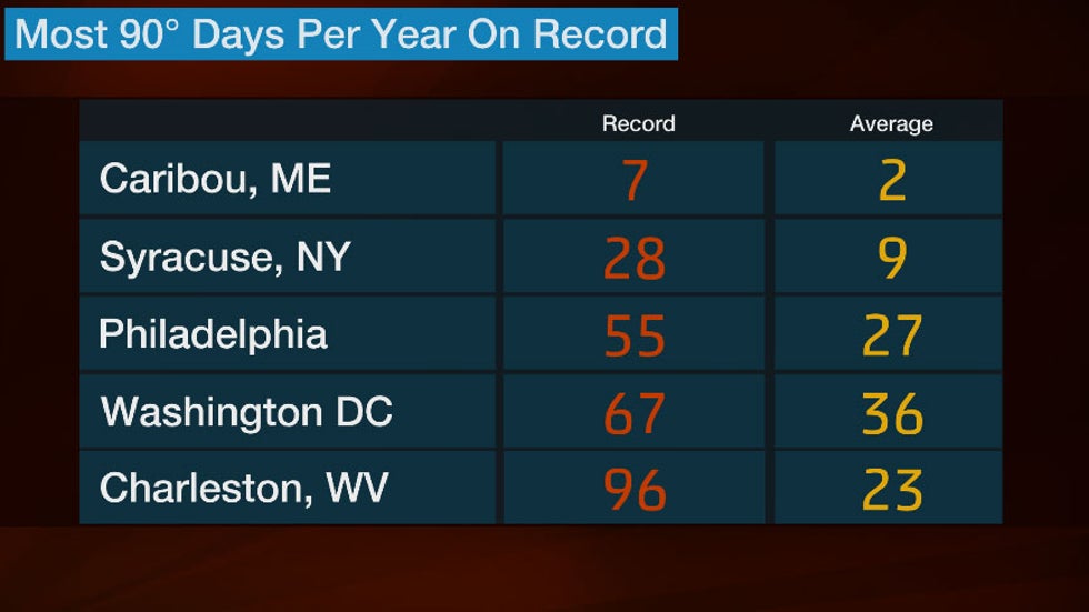 Farther south, New York City recorded 39 days of highs of at least 90 degrees in 1991 and 1993, while more than two months of 90-degree days have occurred in Washington D.C. and Richmond, Virginia.