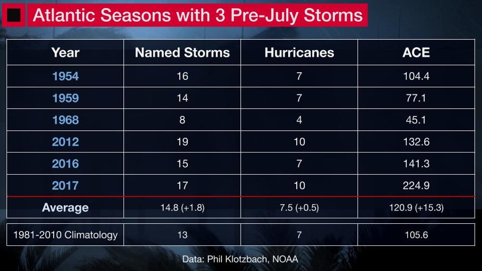Using this third storm as a benchmark, we take a look back at hurricane seasons with at least three named storms by July 1 and found six examples since 1950.