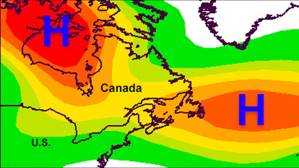A persistent weather pattern has been to blame for the warmth – namely, a ridge of high pressure in the upper atmosphere stretching from eastern and central Canada through New England to the North Atlantic. You can see this in the yellow and orange shadings in the map below.