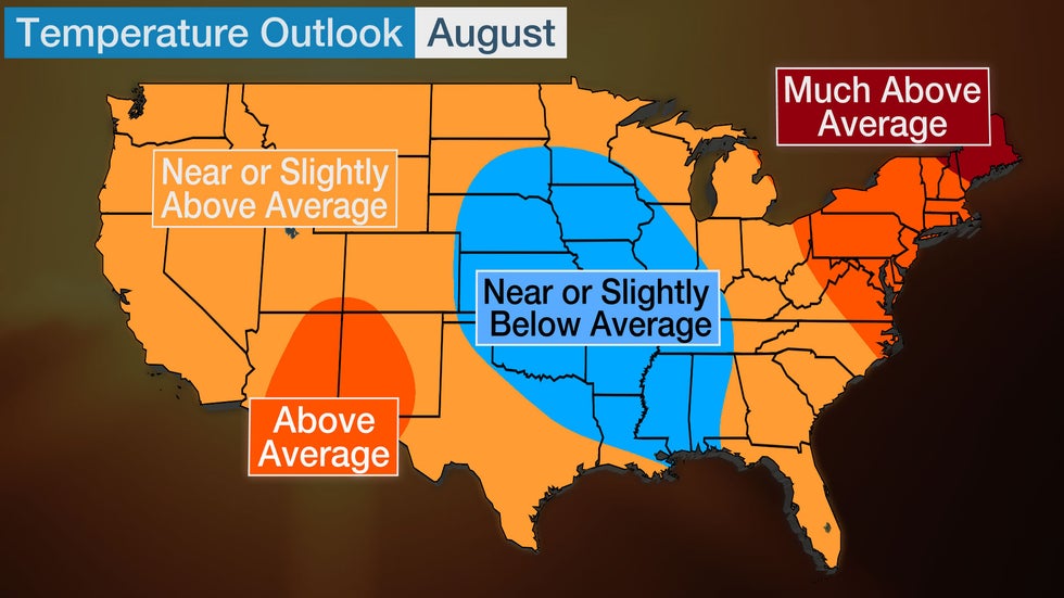 Otherwise most of the West, Great Lakes and Southeast can expect temperatures in August to be near or slightly above average.