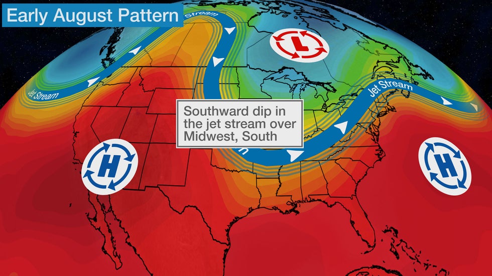 The pattern that will start August is not expected to last. A reversal to conditions that have dominated this summer is likely to emerge for the second half of the month.