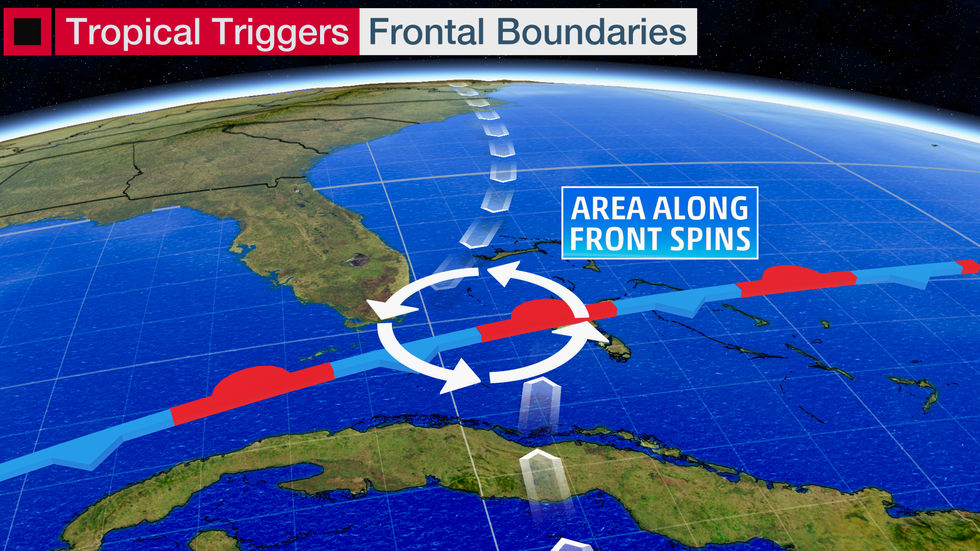 Occasionally, these decaying frontal boundaries can feed off of the warmer waters of the Gulf of Mexico or the Atlantic and develop into a diffuse line of showers and thunderstorms with a little large scale spin.