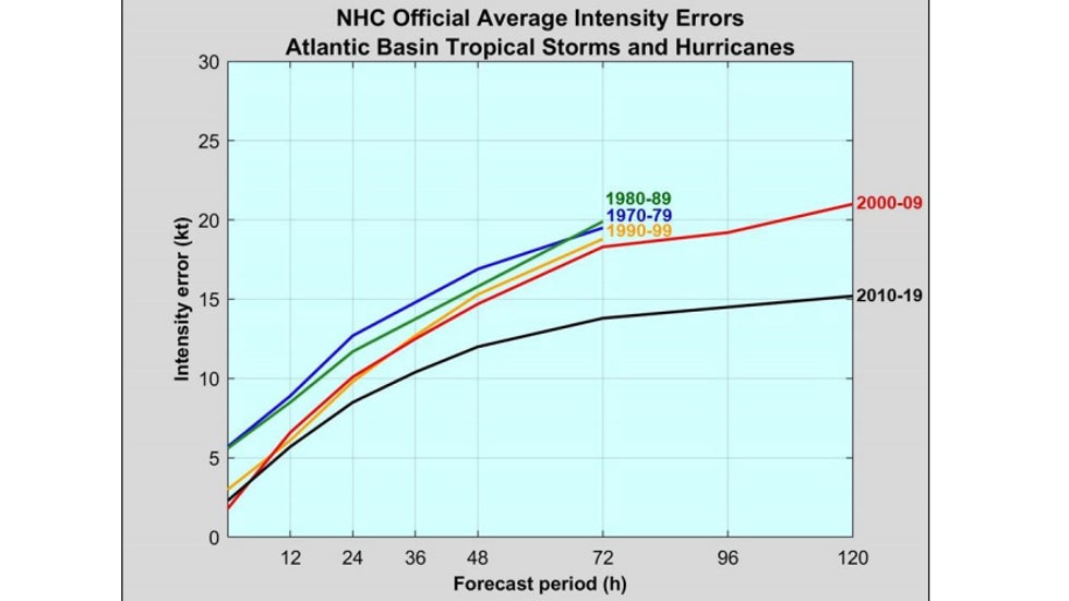 Intensify forecast errors from 2010 to 2019 decreased significantly when compared to previous decades (black line in the graph below). This is especially the case for forecasts made 36 to 120 hours from a storm's current location, the study said. For the NHC's five-day forecast point, or 120 hours in advance of a storm's current position, there was a 25% to 30% drop in intensity forecast errors.