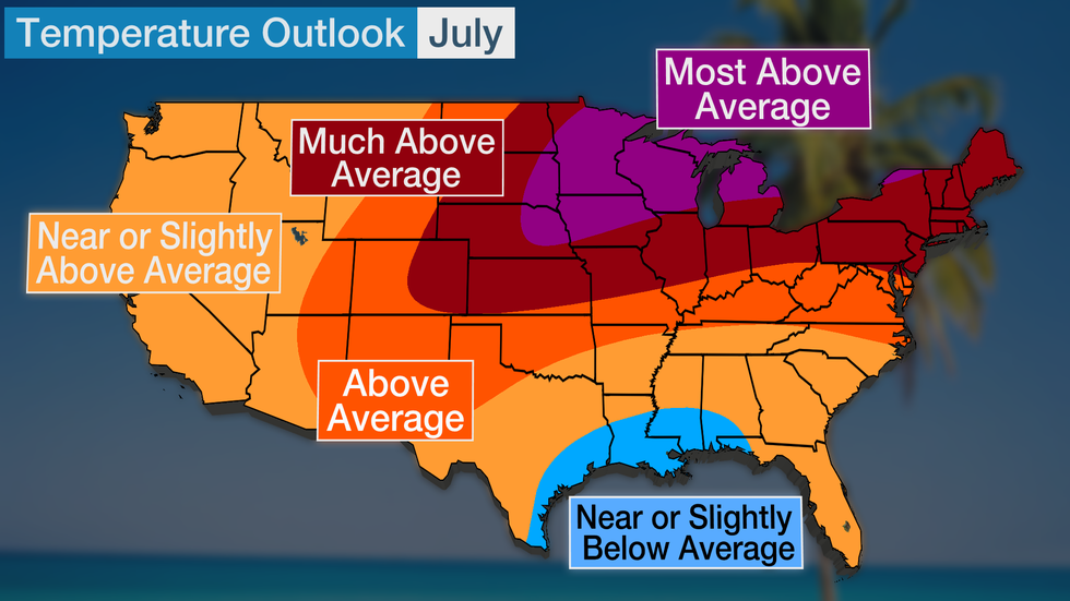 If you want a more typical summer, head to the Gulf Coast this July where temperatures are expected to be near average. Keep in mind, though, that highs will not feel cool in this region with temperatures averaging in the 80s and 90s.
