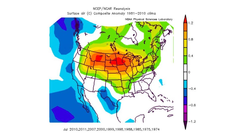 A composite of the most recent 10 La Niña Julys shows that above average heat has occurred throughout the northern and central U.S.