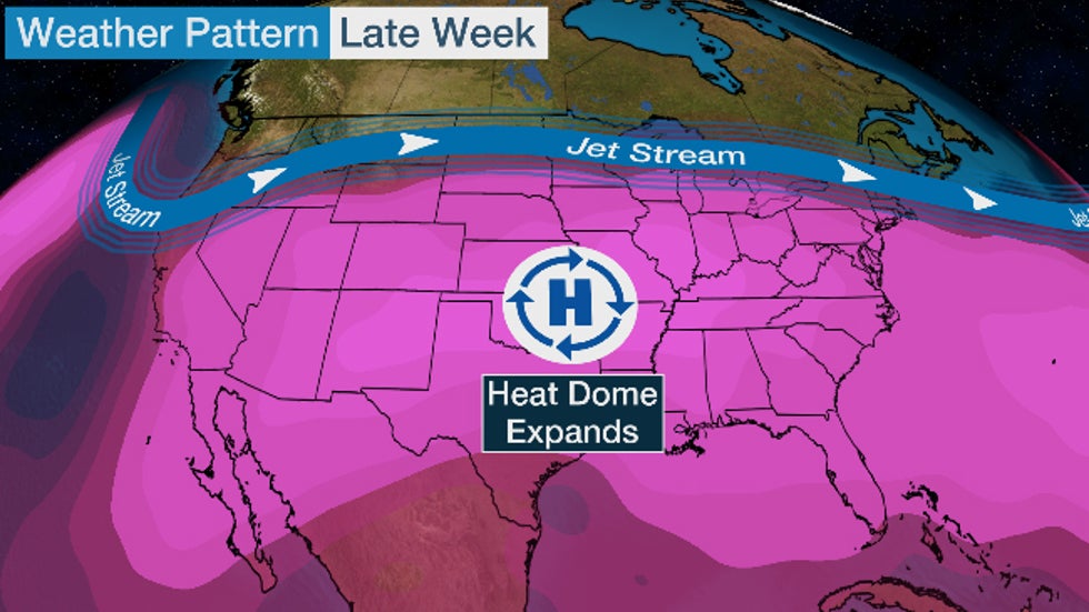 A dome of high pressure aloft responsible for the Southwest heat wave will expand and stretch eastward across much of the rest of the country late this week.