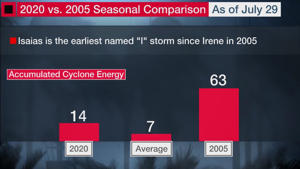 Using a measure called the ACE index – short for Accumulated Cyclone Energy – which takes into account not only the number, but also the intensity and longevity of storms and hurricanes, 2020's start pales in comparison to 2005 through July 29, according to Klotzbach.