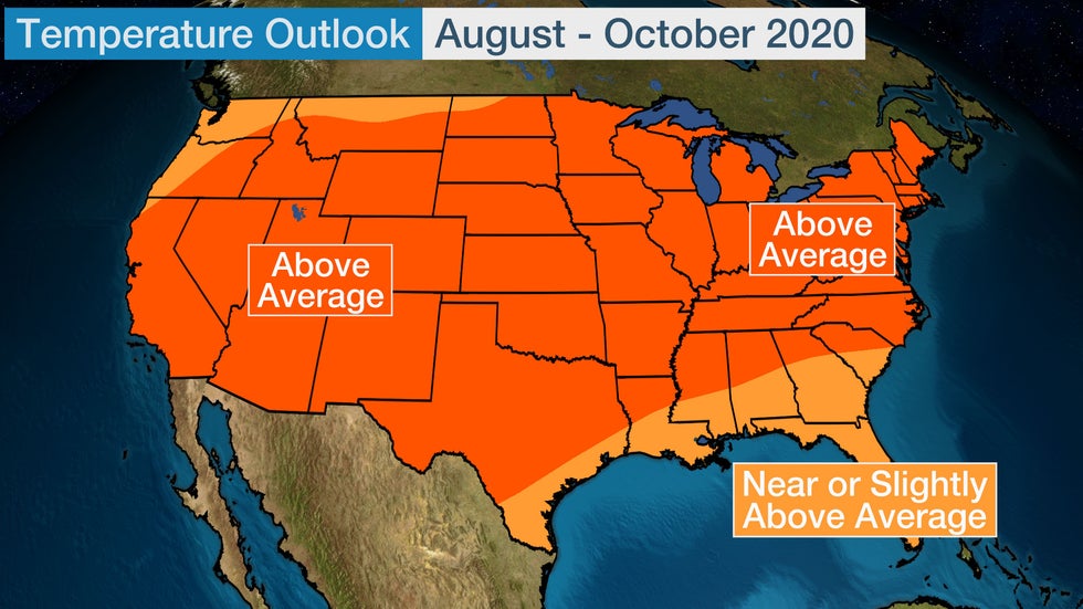 Warmer-than-average temperatures are anticipated from California into the Plains and Midwest, as well as into much of the South and East from August through October. Temperatures may trend near or slightly above average near the Gulf Coast and parts of the Southeast, including Florida, as well as from the Northwest coast into northern Idaho, northern Montana and northwestern North Dakota.