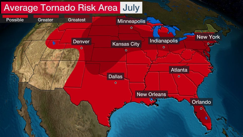 The July severe weather peak also holds in parts of the Great Lakes, Northern Plains and northern Rockies.