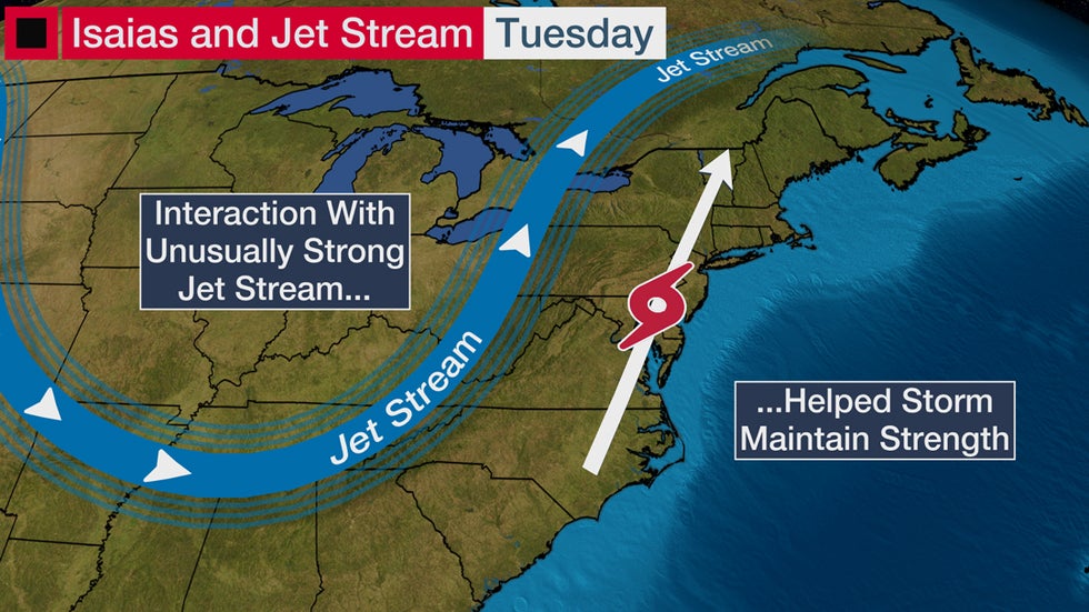 Strong jet stream winds can help intensify coastal storms like nor'easters in winter. It's likely Isaias received a similar boost of energy as it began its transition into a non-tropical low-pressure system over the Northeast, and that meant it weakened at a slower pace than usual.