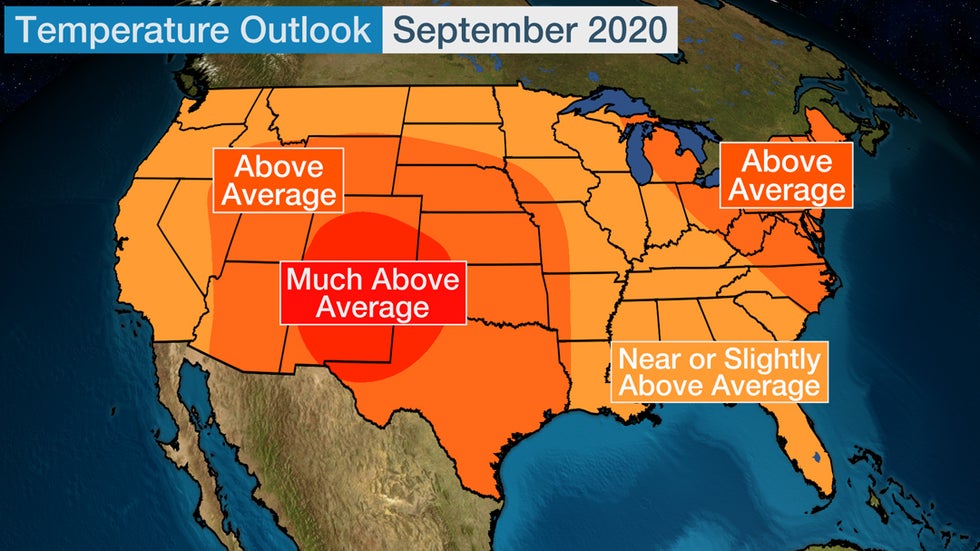 Parts of the Central and Southern Plains and Rockies are also forecast to have temperatures above or much above average.