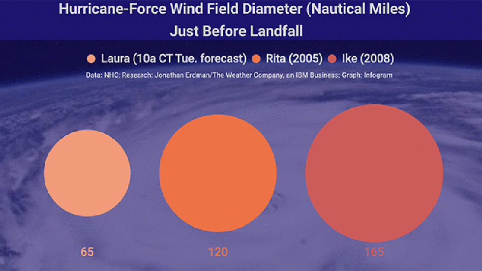 Below is a comparison of the tropical-storm-force (at least 39 mph winds) and hurricane-force wind field (at least 74 mph winds) forecast for Hurricane Laura just before landfall from the 10 a.m. CDT Tuesday NHC forecast, compared to the wind fields just before landfall in 2005's Hurricane Rita and 2008's Hurricane Ike.