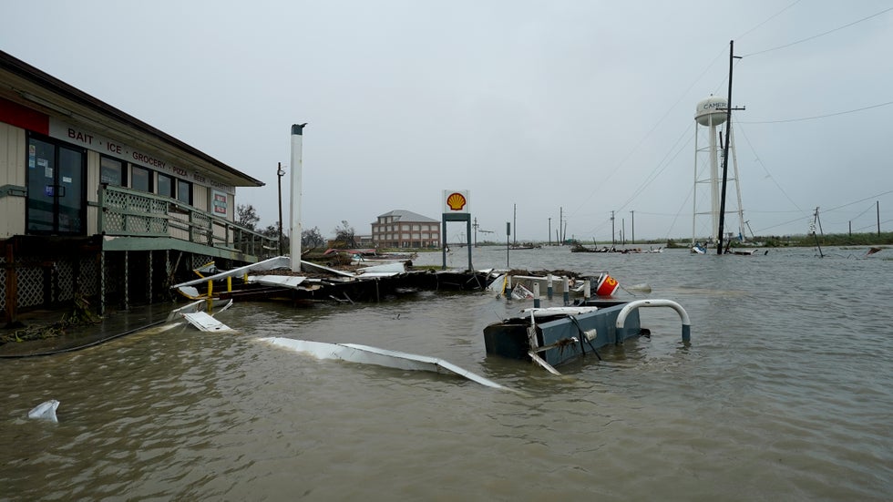 Aerial video from the parish showed houses reduced to nothing but rubble. Floodwater encircled many of the stilt houses that did remain standing, though their roofs were often ripped open.