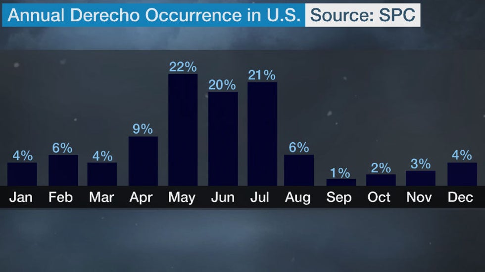 They are most common in late spring and summer in the U.S., with a peak from May through July. However, they do occur in August and are still very damaging, as seen by the derecho that raced 770 miles in 14 hours across the Midwest early this week.