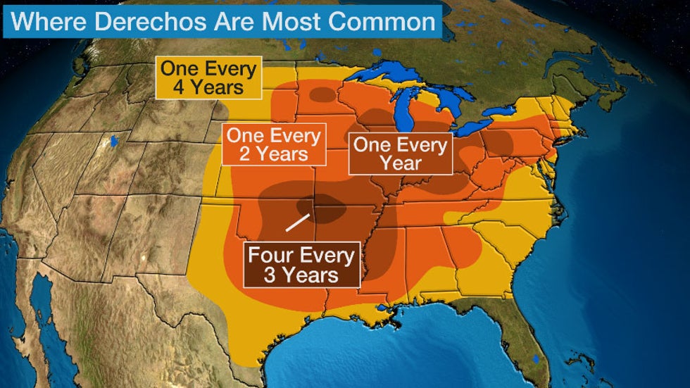 Derechos can occur in many states east of the Rockies, but they are most common in parts of the Plains, Midwest and South.