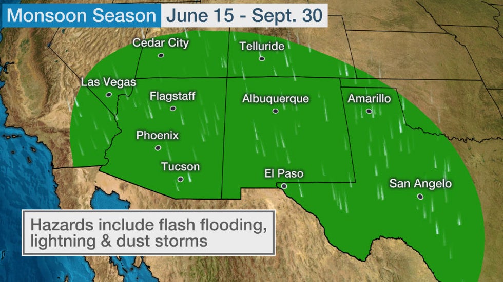The Southwest monsoon is typically active from June 15 through Sept. 30. A monsoon is a change in seasonal winds, and in this case, the shift in winds results in an increase in thunderstorm activity in the region.