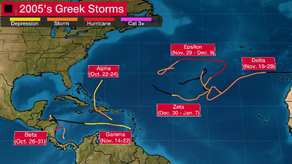 Incredibly, this season's first two Greek storms developed more than a month earlier than the 2005 season. Tropical Storm Alpha developed on Oct. 22, 2005 and Hurricane Beta first became a tropical storm on Oct. 27, 2005.