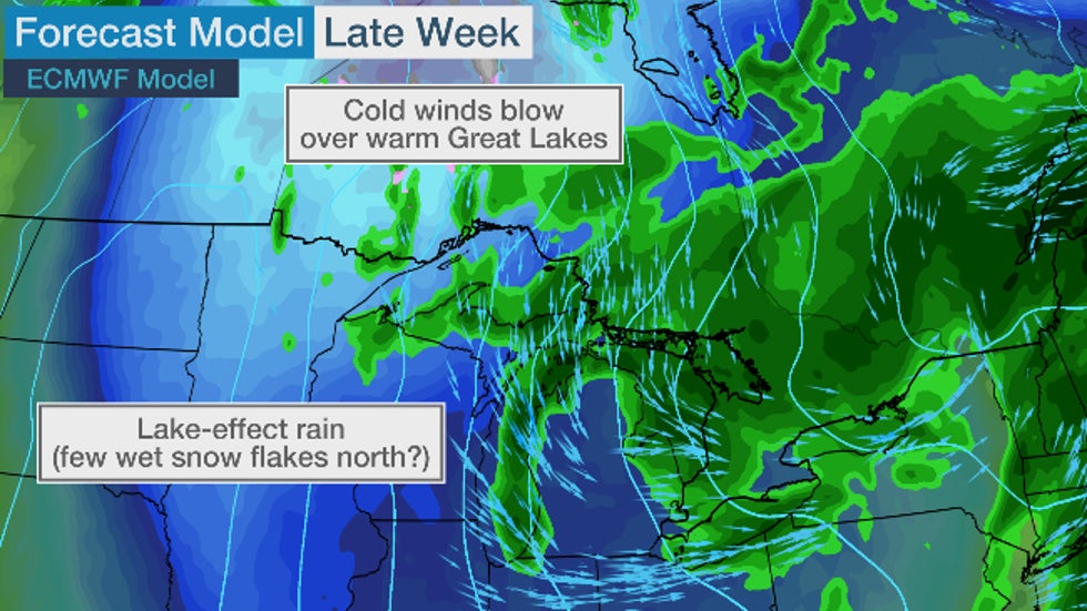 So colder air flowing over these relatively warm bodies of water will generate bands of lake-effect precipitation, primarily rain, next week.