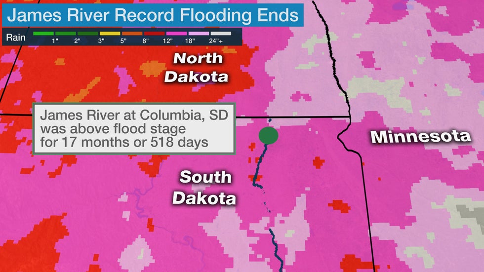 The river gauge at Columbia, South Dakota, led the way for the most consecutive days above flood stage.