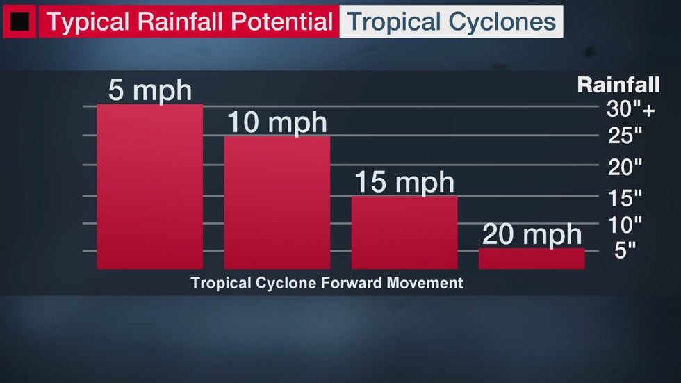 The amount of rainfall a tropical storm or hurricane can produce is a function of its forward speed. As illustrated in the graphic below, the slower the speed, the more incredible the rainfall amounts can become.