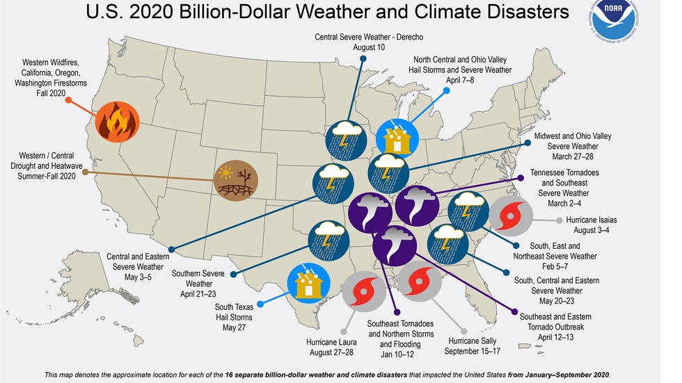 The U.S. has been hit by 16 billion-dollar weather disasters so far in 2020, tying 2011 and 2017 for the most such events in a year. Hurricane Laura is the most expensive weather disaster so far this year with an estimated cost of $14 billion.