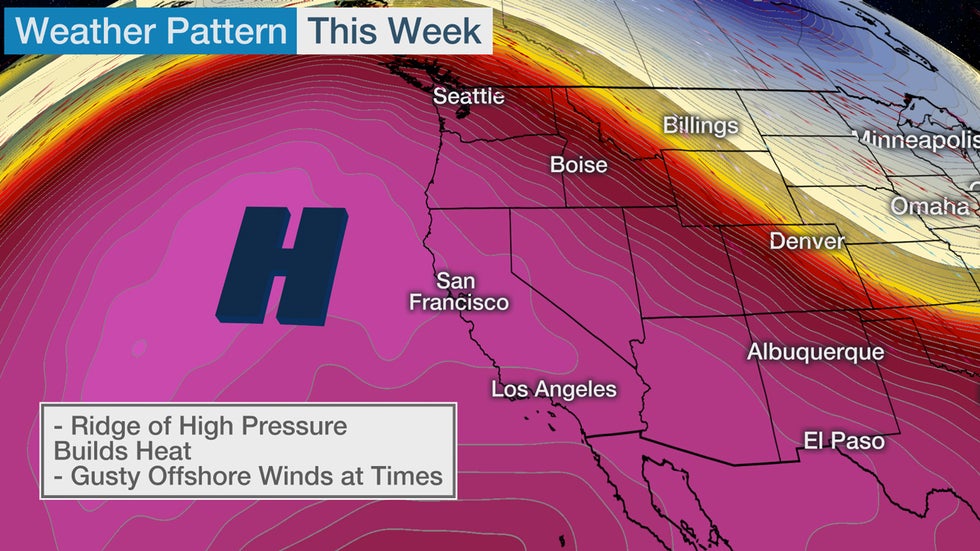 This week's highest fire danger is expected in Northern California during the second half of the week. That's because an area of high-pressure building over the Great Basin will funnel stronger offshore winds through this part of the state.