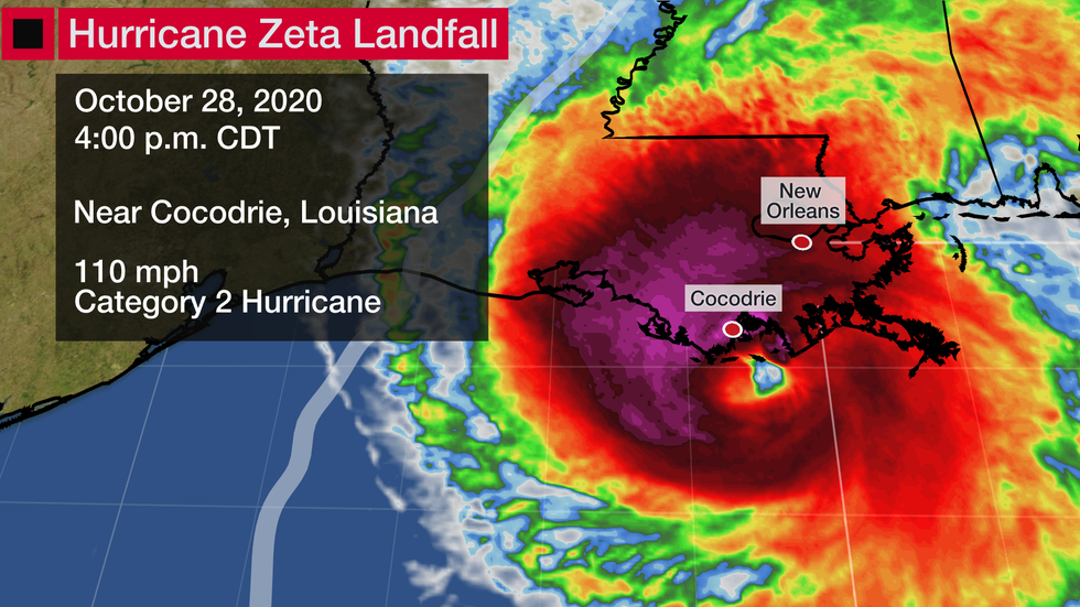 Zeta's landfall was near Cocodrie, Louisiana, at 4 p.m. CDT and maximum sustained winds were 110 mph.