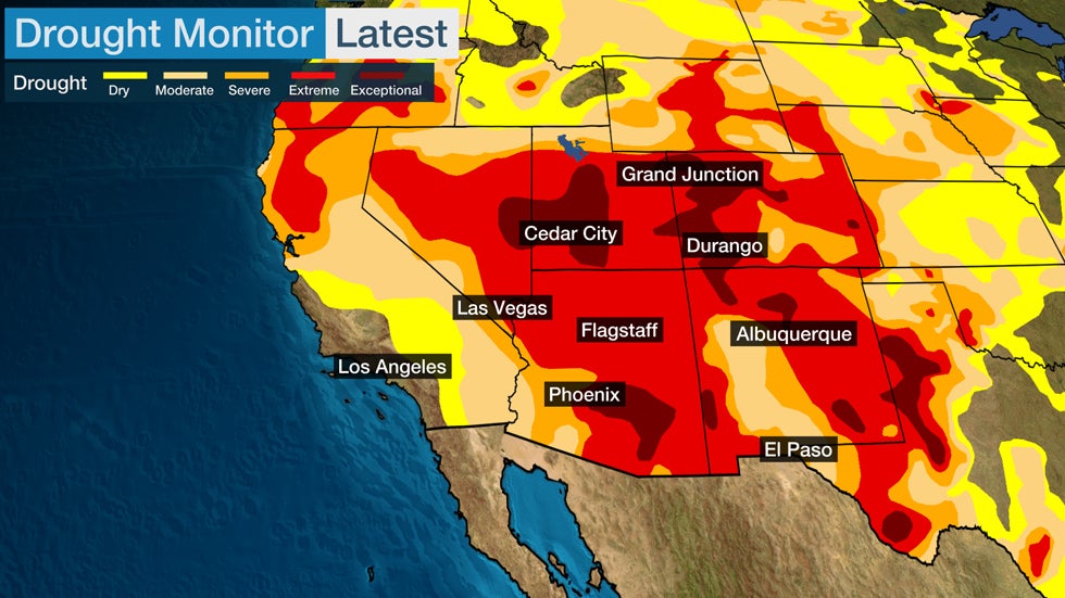 Extreme and exceptional drought - the two worst categories on the U.S. Drought monitor - are widespread across the Southwest, from West Texas to Nevada and Arizona.