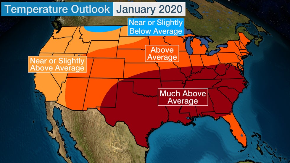 Temperatures in the nation's southern half, from the Southern Plains into the Southeast and southern mid-Atlantic, are expected to be much above average. Only northern Montana is expected to have colder than average temperatures.