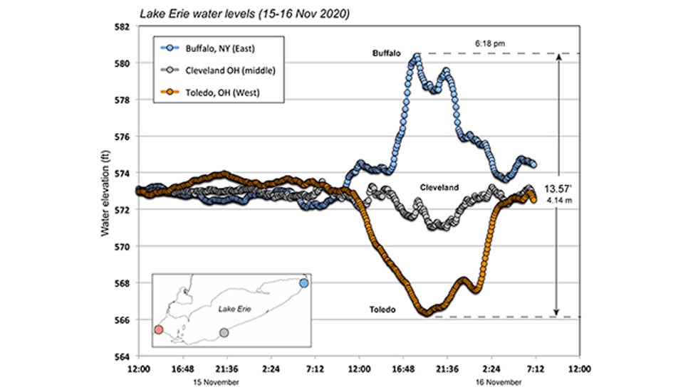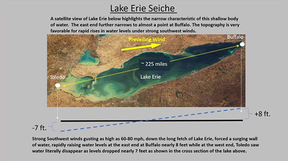 The wind-driven seiche on Lake Erie Sunday sent a wall of water east-northeast over the long and narrow lake, rapidly raising water levels about 7 feet at Buffalo, while at the other end of the lake, the water levels at Toledo dropped nearly 7 feet. It resulted in an amazing net difference of over 13 feet from one end to the other.