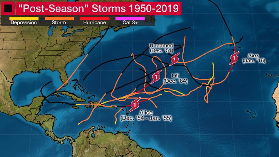 Four of those postseason storms became hurricanes, most recently Hurricane Alex in January 2016.