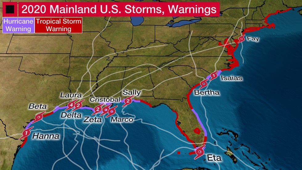 Nearly the entire United States coastline from the Gulf of Mexico to the Eastern Seaboard has been under a tropical storm or hurricane warning at some point during the 2020 hurricane season.