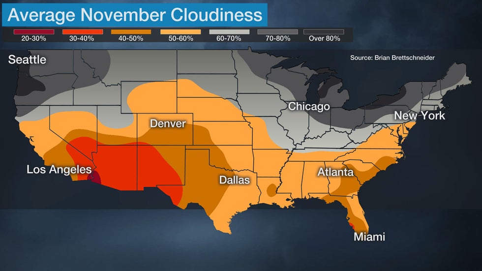 November is usually the cloudiest month of the year in parts of the Northern Plains and upper Midwest, including the Twin Cities and Milwaukee, Wisconsin, according to climatologist Brian Brettschneider. The cloudy peak arrives in December in other parts of the Midwest and Northeast, but November kicks off all the gloom.