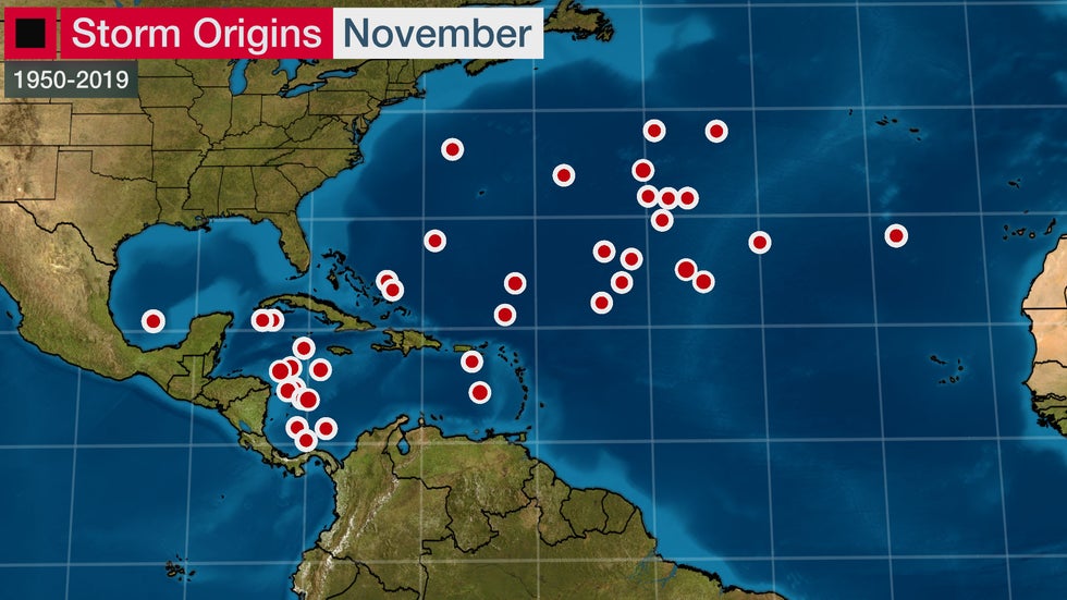 Tropical cyclone origins in November based on data from 1950-2019.Florida's Dry Season Begins