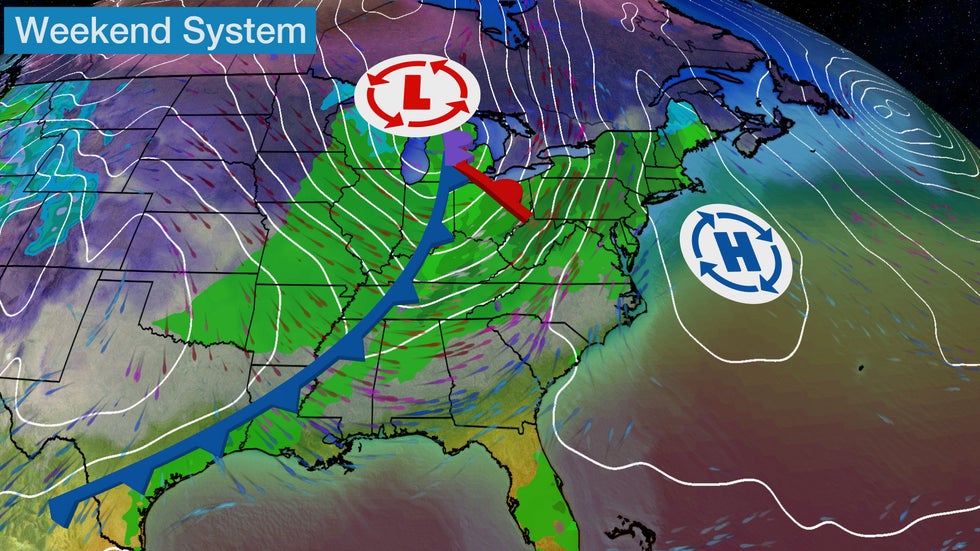 This frontal system will emerge in the Plains early Saturday and track through the Midwest and East through Sunday night.