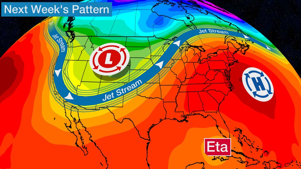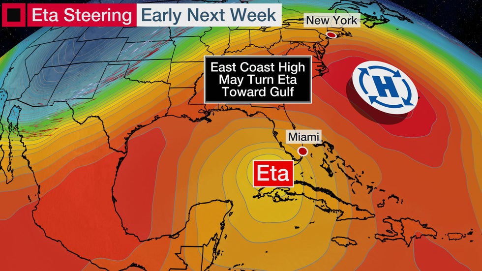 The area of high pressure in the East will block Eta from escaping eastward and away from the U.S.; Rather, it will allow the storm to meander and linger in the Gulf of Mexico or near Florida.