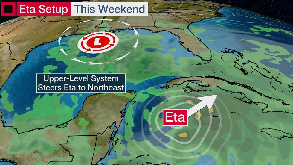In the short term, Eta is expected to track toward Cuba, the Bahamas and Florida, likely as a tropical storm, this weekend into early next week.