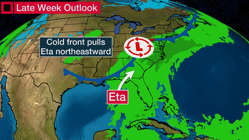 Eta may not exit the stage until late next week.The Weather Company’s primary journalistic mission is to report on breaking weather news, the environment and the importance of science to our lives. This story does not necessarily represent the position of our parent company, IBM.