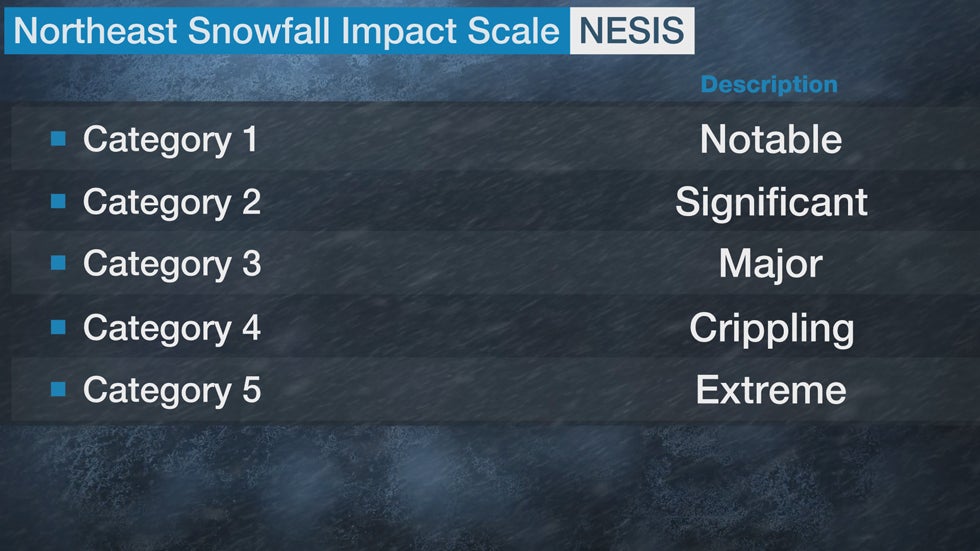 In general, widespread heavy snowfall over highly populated areas like the Interstate 95 corridor from Boston to Washington, D.C. produces a high NESIS value. The storms are ranked Category 1 (notable) to Category 5 (extreme) based on the value.